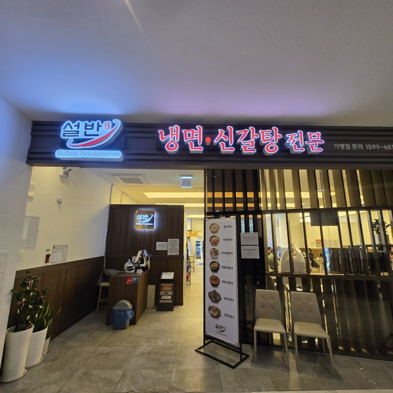 일산 차병원 2층에 위치한 설반 매장은 작아 보이는 입구지만 매장 내부가 넓고 청결하고 정돈된 느낌을 줍니다. 주문은 키오스크를 통해 간편하게 할 수 있으며, 직원 응대도 가능해 사용자 친화적인 환경을 제공합니다. 메뉴판을 보면 냉면류와 갈비탕이 눈에 띄는데, 그중에서도 ‘신갈탕’은 가장 고가에 속하는 메뉴입니다.