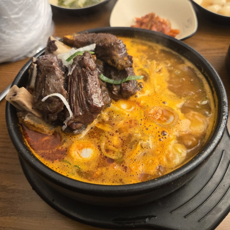 1인 20,000원이라는 가격은 점심식사 기준으로는 다소 높게 느껴질 수 있지만, 음식이 제공되는 순간 그 이유는 명확해집니다. 김이 모락모락 피어오르는 국물은 깊은 붉은색을 띠며, 일반적인 갈비탕의 맑은 국물과는 다른 강렬한 비주얼을 자랑합니다. 강한 인상을 주는 이 비주얼은 보는 즉시 입맛을 돋우며, 고기 위로 올려진 고명과 안창살은 만드는 정성을 고스란히 느끼게 합니다.
